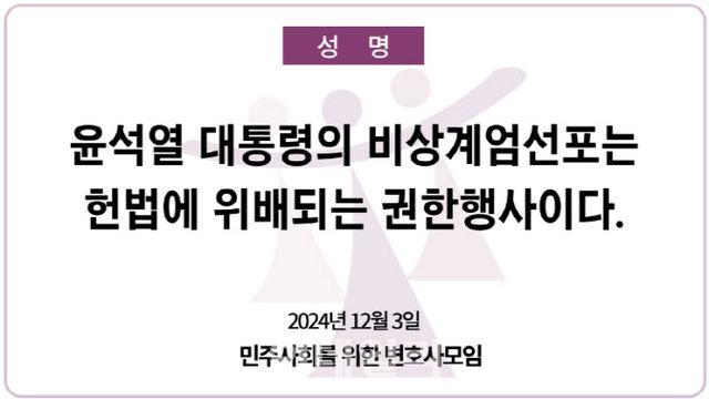 민변은 지난 3일 윤 대통령의 비상계엄 선포 직후 성명을 내고 “윤석열 대통령이 비상계엄 선포의 사유로 설명한 국회의 탄핵소추 등은 계엄법 제2조에 따른 비상계엄 선포 요건이 안 된다는 점이 헌법과 법률의 해석상 명백하다”고 지적했다.