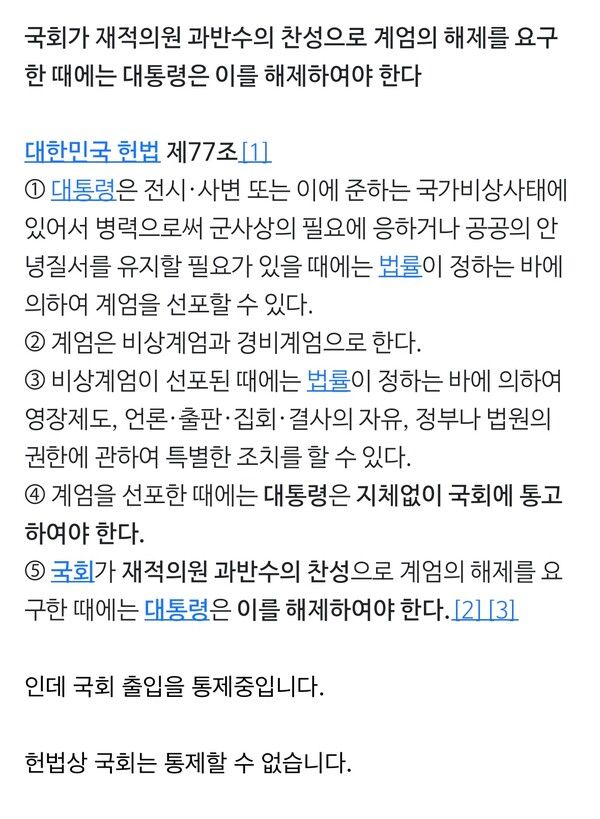 국회는 재적의원 과반수의 찬성으로 계엄령 해제를 요구할 수 있으며, 대통령은 이를 즉시 해제해야 한다.