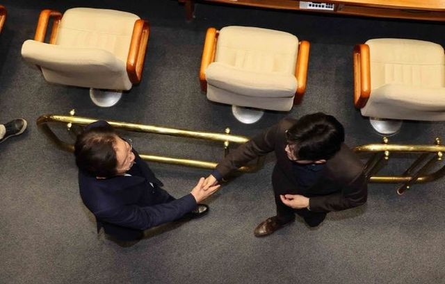 4일 새벽 서울 여의도 국회 본회의장에서 한 대표와 이 대표가 만나 악수를 건넨 뒤 잠시 동안 이야기를 나누는 모습이 포착됐다.