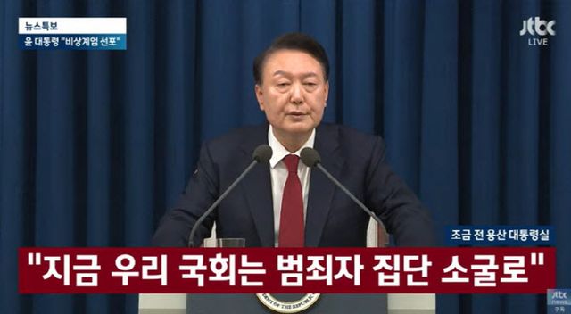 윤 대통령은 이날 오후 10시 20분께 긴급 브리핑을 통해 비상계엄을 선포했다. 선포 직후 대통령실은 계엄군을 동원해 국회 출입문을 폐쇄했다.