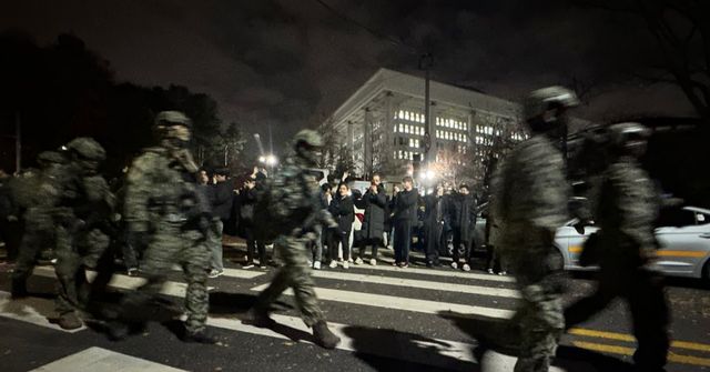 윤석열 대통령의 비상계엄 해제 요구 결의안이 국회 본회의에서 통과된 4일 새벽 무장 계엄군이 국회를 나서고 있다. 여야는 이날 본회의에서 재석 190명 중 찬성 190명으로 비상계엄 해제 요구 결의안을 가결 처리했다. 이에 따라 계엄령 선포는 무효가 됐다고 국회의장실은 설명했다. / 뉴스1