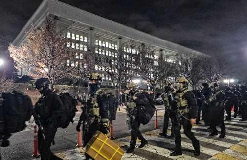 국회 본회의에서 비상계엄 해제를 의결한 4일 새벽 계엄군 병력이 국회에서 철수하고 있다.