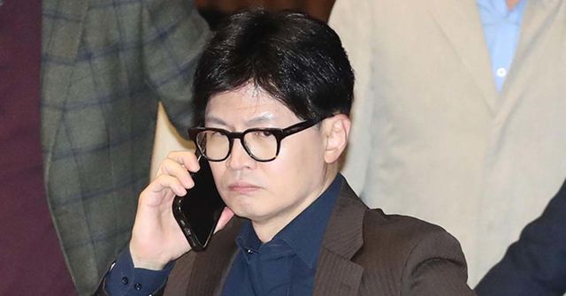 윤석열 대통령이 비상계엄령을 선포한 가운데 4일 새벽 서울 여의도 국회 본회의장에서 한동훈 국민의힘 대표가 심각하게 전화통화를 하고 있다. / 뉴스1