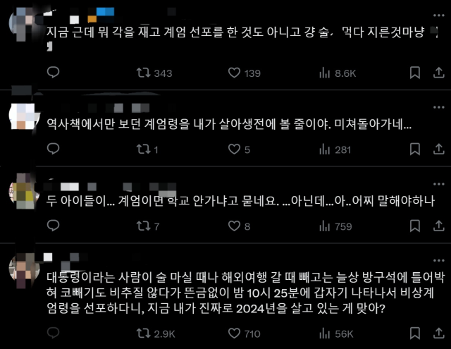 윤 대통령의 비상계엄령 선포 직후 네티즌들은 밤중에 갑작스레 선포된 비상계엄에 황당하고 답답한 마음을 표출했다. X(옛 트위터), 페이스북, 인스타그램 등 다수의 사회관계망서비스(SNS)에서는 "술 먹다 지른 것마냥 계엄령을 선포했다", "역사책에서만 보던 계엄령을 살아생전 볼 줄이야", "뜬금없이 밤 10시 25분에 갑자기 나타나 비상계엄령을 선포하다니 2024년에 살고 있는 게 맞나" 등 대통령을 향한 날선 비판이 쏟아졌다.