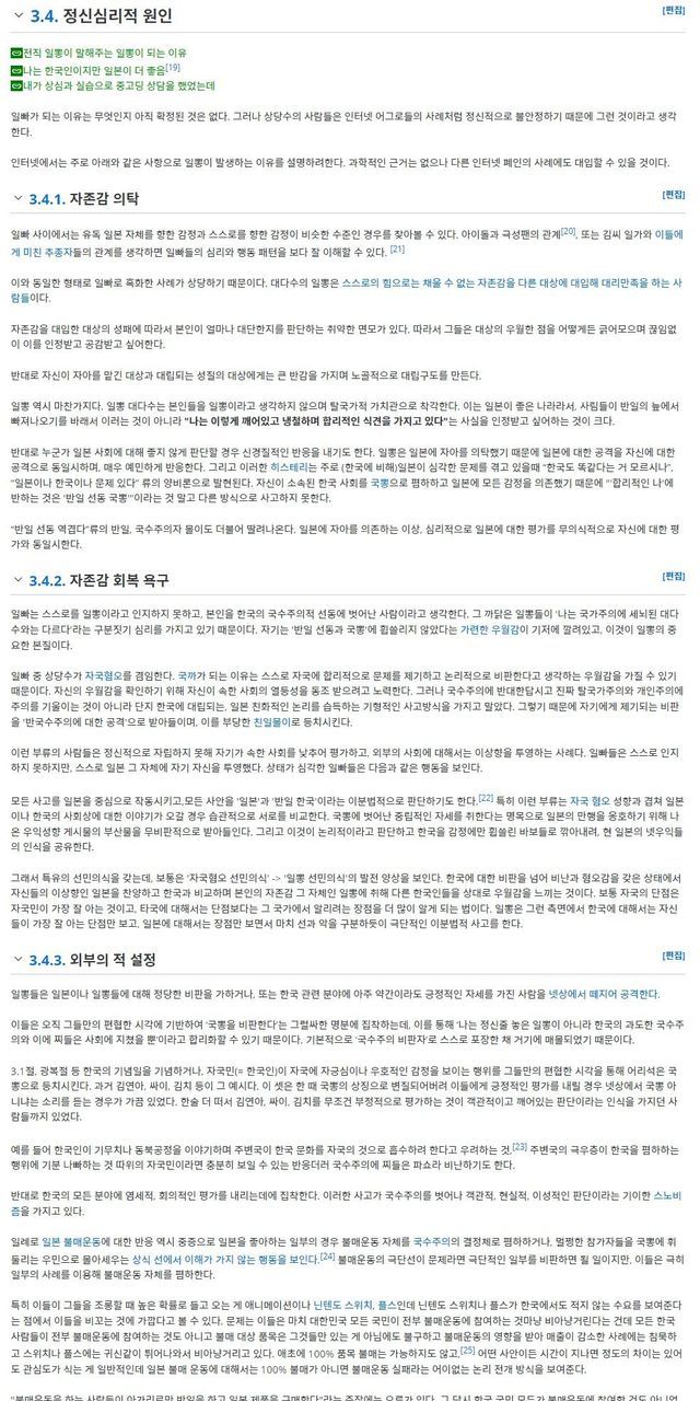 2. 낮은 자존감을 일본을 찬양해 띄우고 자신이 속한 사회(한국)를 폄훼 함으로써 자기자신의 자존감을 끓어올린다.(정신승리)
