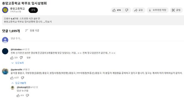 2년 전 충암고등학교 유튜브 채널에 올라온 학부모 입시설명회 영상에 3개월 전 달린 댓글이 눈길을 끈다.
