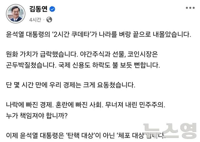 (뉴스영 이현정 기자) 김동연 경기도지사는 4일 자신의 SNS 페이스북을 통해 지난 3일 밤 윤석열 대통령의 비상계엄 선포에 대한 입장을 밝혔다.