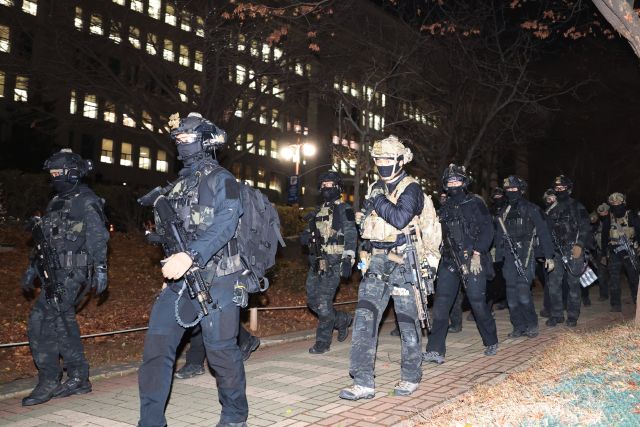 윤 대통령이 계엄을 선포하자 군은 4일 국회 회의실 창문을 깨고 진입 작전을 폈다. 총을 들고 야시경을 쓴 계엄군들은 본회의장 정문을 밀고, 헬기를 타고 진입해 본회의장 앞 로텐더홀까지 밀고 들어왔다.