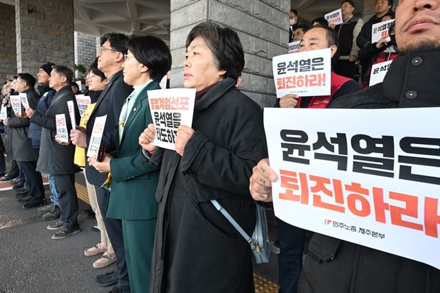 민주노총 제주본부와 전농제주도연맹, 진보당제주도당, 정의당제주도당 등은 4일 제주도청 앞에서 기자회견을 열고 "불법 계엄선포 윤석열 대통령을 타도하자"고 목소리를 높였다.