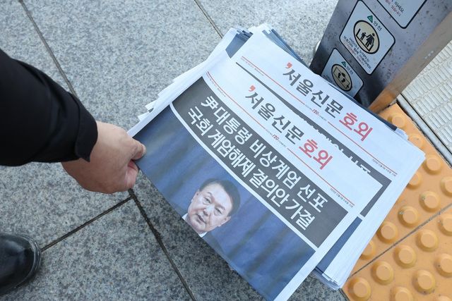 윤석열 대통령이 긴급 대국민 담화를 통해 비상계엄 해제를 선언한 4일 오전 서울 종로구 종각역 인근에서 시민들이 관련 내용이 적힌 호외를 가져가고 있다. / 뉴스1