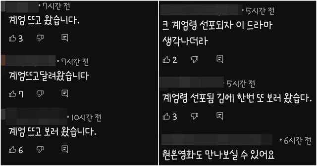 이후 유튜브에선 한 드라마 영상에 "계엄령 보고 생각나서 다시 보러 왔다"는 댓글이 이어졌다.