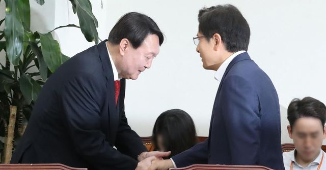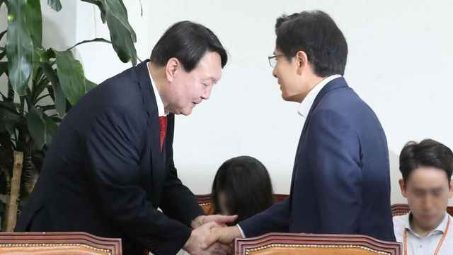 2019년 8월 8일 윤석열 대통령(당시 윤석열 신임 검찰총장)이 서울 여의도 국회에서 황교안 전 국무총리(당시 자유한국당 대표)와 예방, 악수를 나누고 있다. / 뉴스1