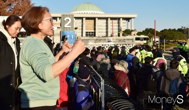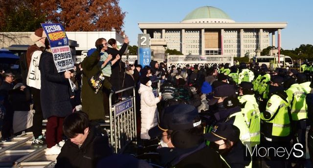 윤석열 대통령의 비상계엄령 선포 및 해제 후폭풍이 지나간 4일 서울 여의도 국회의사당 앞 사거리에서 시민 및 정당, 사회단체 관계자들이 대통령 퇴진을 외치고 있다.