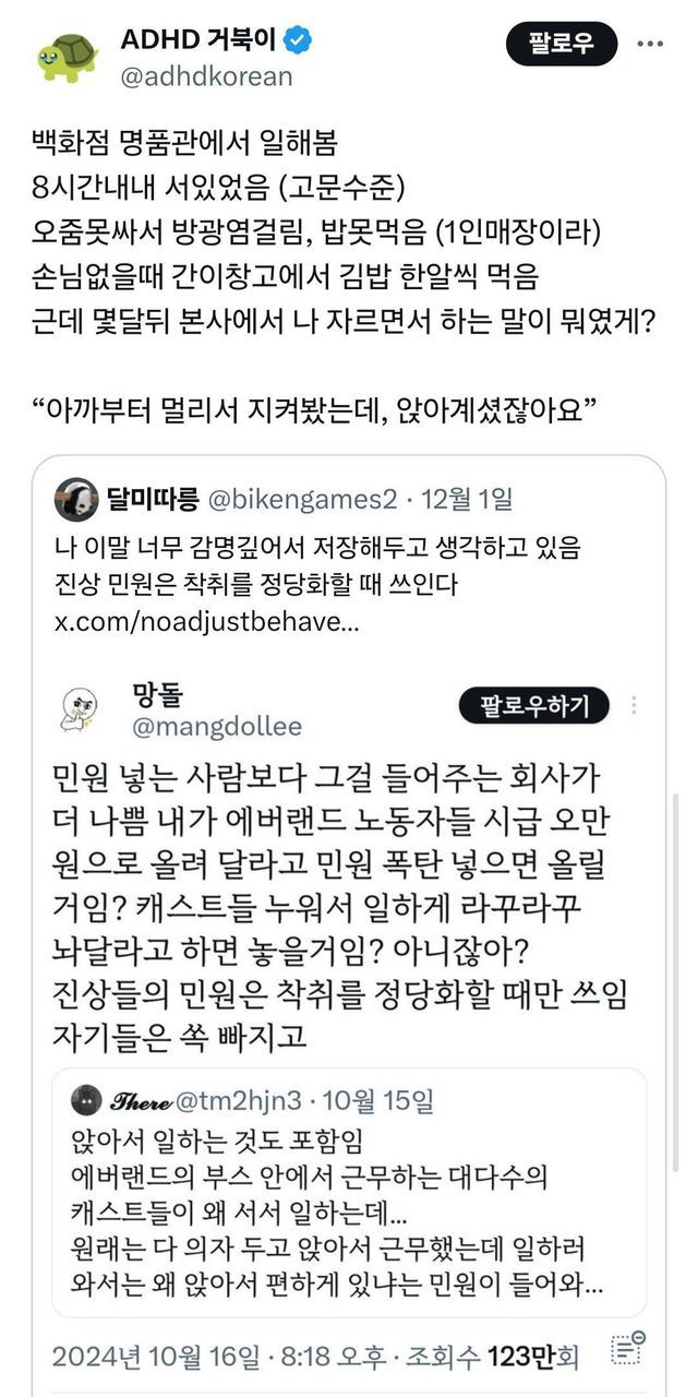 백화점 명품관에서 일해봄 '아까부터 멀리서 지켜봤는데, 앉아계셨잖아요”.twt..