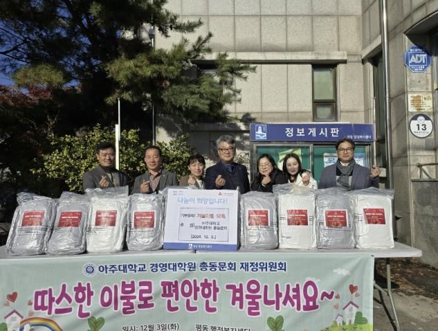 아주대학교 경영대학원 총동문회 재정위원회는 매년 어려운 이웃을 위하여 겨울이불을 후원하는 등 지역사회 나눔 활동을 몸소 실천하고 있다.