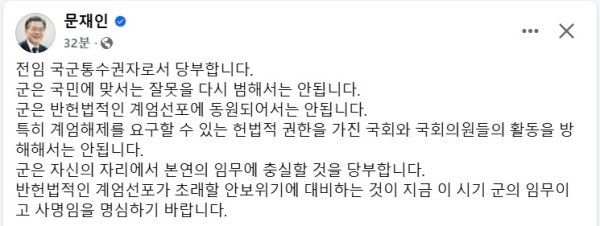 문 전 대통령은 전임 국군통수권자로서 "군은 국민에 맞서는 잘못을 다시 범해서는 안 된다"며, "군은 반헌법적인 계엄선포에 동원돼서는 안 된다"고 경고했다.