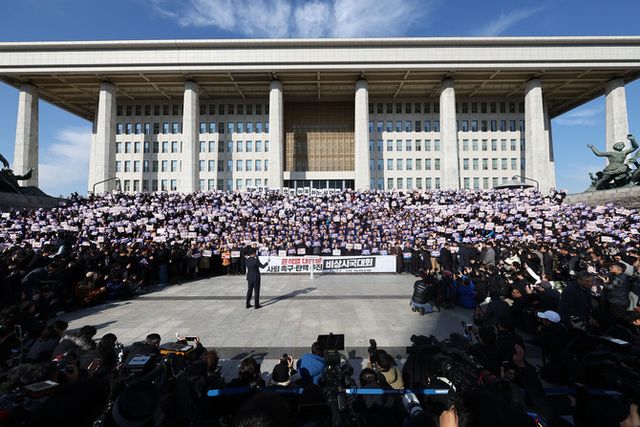 4일 서울 여의도 국회 본청 앞 계단에서 열린 '윤석열 대통령 사퇴촉구 탄핵추진 비상시국대회'에서 이재명 더불어민주당 대표, 조국 조국혁신당 대표를 비롯한 야당 의원과 참가 시민들이 구호를 외치고 있다. ⓒ 연합뉴스