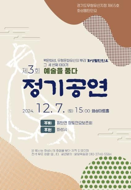 [와이뉴스] 경기도 무형유산 제65호 ‘화성팔탄민요’의 제3회 정기공연이 7일 오후 3시 화성아트홀에서 열린다.