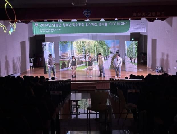 [와이뉴스] 양평군은 용문중학교 학생들을 대상으로 정신건강 인식개선 및 학교폭력 예방을 위해 3일 용문중학교 강당에서 청소년 정신건강 인식개선 뮤지컬 ‘FLY HIGH’ 공연을 선보였다.