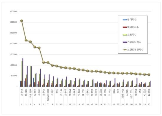 2위, 임영웅 브랜드는 참여지수 271,800 미디어지수 381,323 소통지수 561,954 커뮤니티지수 954,148이 되면서 브랜드평판지수 2,169,225로 분석됐다. 지난 11월 브랜드평판지수 1,469,001과 비교해보면 47.67% 상승했다.