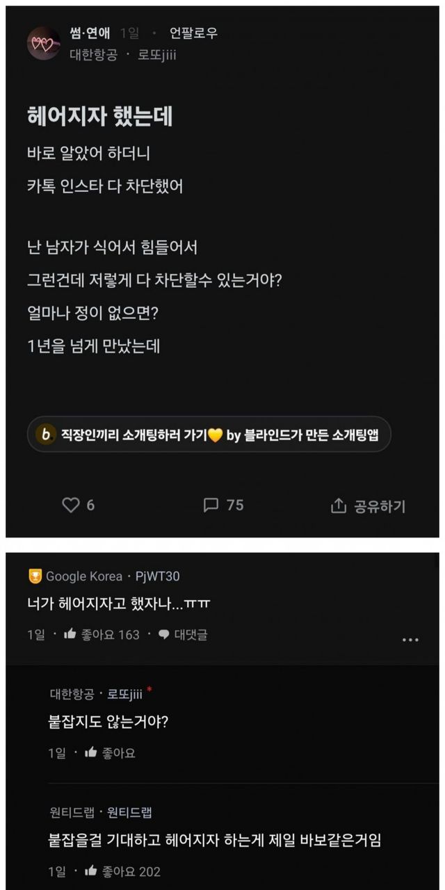 헤어지자 했더니 바로 차단당해서 당황한 블라녀..