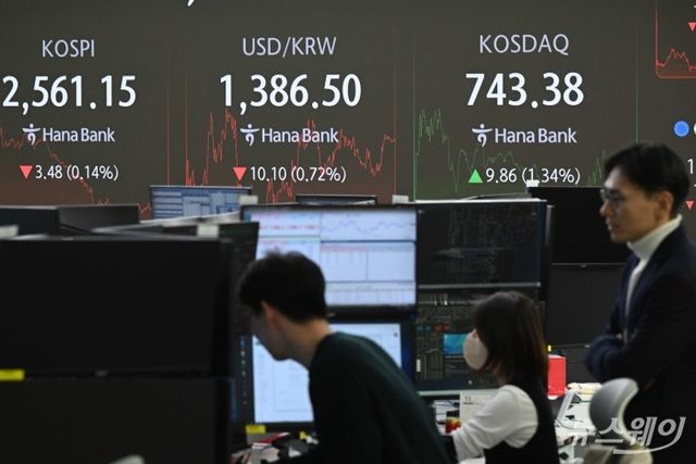 코스피와 코스닥, 원·달러 환율 지수가 8일 오후 서울 중구 하나은행 본점 딜링룸에서 표시돼 있다. 이날 코스피는 전장보다 3.48(01.4%)포인트 하락한 2,561.15에 마감했고, 코스닥은 전장보다 9.86(1.34%)포인트 오른 743.38로 장마감 했고, 원·달러 환율은 10.10(0.72%) 내린 1,386.50으로 나타내고 있다. 사진=강민석 기자 kms@newsway.co.kr