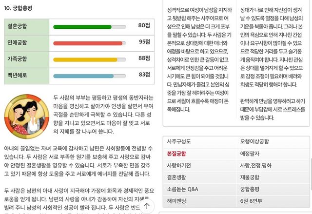 온라인 사주 전문 사이트 '위키사주'에 따르면 두 사람은 상황이 어려워지면 함께 문제를 극복하는 현명한 커플이다. 늘 지혜를 나누고 협력하는 관계를 유지하게 된다. 즐거운 만남이 예상되고, 상대가 의기소침해 있을 때 늘 곁에서 원기를 북돋아 주고 내조의 힘을 발휘한다. 인생의 동반자로 알맞지만 사회적인 성공을 위해 조화과 완벽한 만남이나 애틋한 감정이 부족해 열정을 지니도록 노력해야 한다. 상대적으로 좋은 궁합으로 여자의 도움으로 위기를 모면하고 명예를 회복시키며 큰 성공을 이루게 된다.