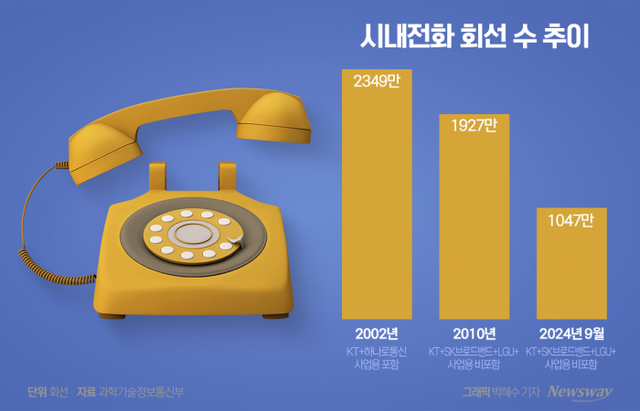 과거 대표적인 통신 수단이던 시내전화(가정용 전화)는 스마트폰 보급이 늘어난 2000년대 중반부터 쓰임이 줄고 있다. 과학기술정보통신부의 '유·무선통신서비스 가입 현황 통계'를 살펴보면 지난 9월 시내전화 회선 수는 약 1047만 회선에 불과했다. 2002년 2349만 회선에 달했던 것과 비교하면 절반에도 미치지 않는 수준이다.