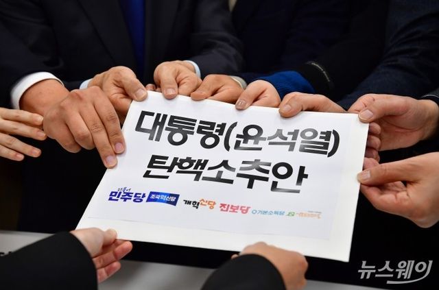 더불어민주당 김용민 의원, 사회민주당 한창민 대표, 기본소득당 용혜인 대표, 조국혁신당 신장식 의원, 개혁신당 천하람 원내대표가 4일 오후 서울 여의도 국회 의안과에 대통령(윤석열) 탄핵소추안을 제출하고 있다. 사진=이수길 기자 Leo2004@newsway.co.kr