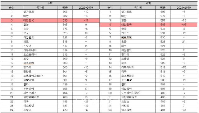 다만 우리나라 학생들의 점수는 2015년을 정점으로 하락세를 보이고 있다. 초등학교 수학은 2015년 608점에서 2019년 600점, 2023년 594점으로, 과학은 2015년 589점에서 2019년 588점, 2023년 583점으로 하락했다.
