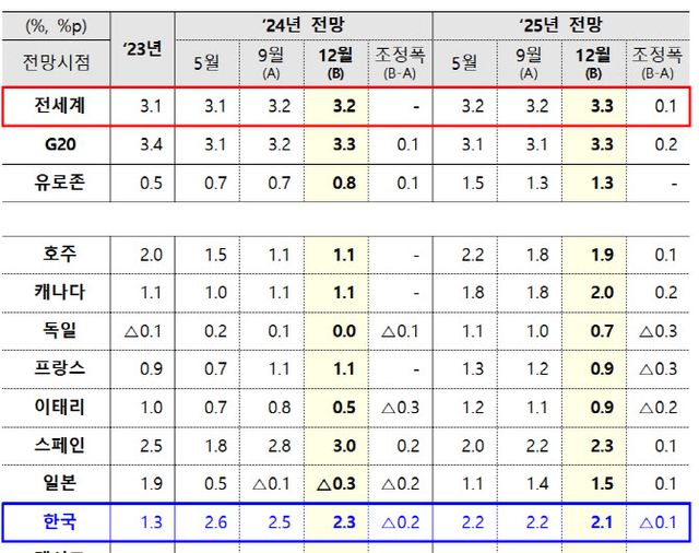 4일 기획재정부에 따르면 OECD는 ‘12월 세계경제전망’ 보고서에서 내년 한국의 실질 국내총생산(GDP) 성장률을 2.1%로 전망했다. 지난 5월과 9월 전망인 2.2%에서 0.1%포인트 하향 조정했다. 올해의 경제 성장률은 2.3%로 전망했다. 9월 전망(2.5%)보다 0.2%포인트 낮췄다.