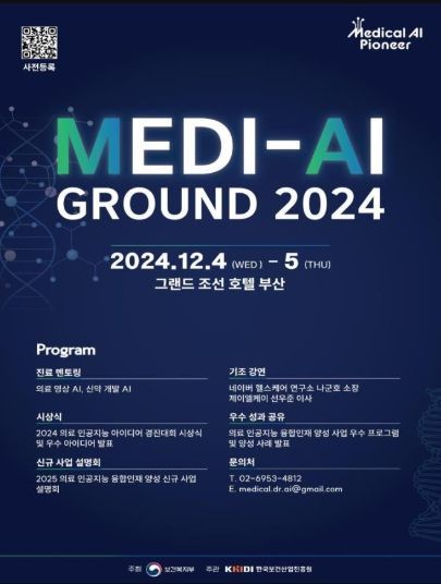[와이뉴스] 보건복지부와 한국보건산업진흥원은 12월 4일부터 12월 5일까지 부산 그랜드조선 호텔에서‘의료 인공지능 융합인재 양성 사업’의 성과 교류 및 확산을 위한 'MEDI-AI GROUND 2024'를 개최한다고 밝혔다.