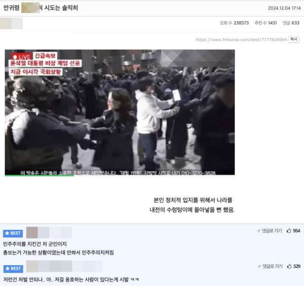 온라인에서는 “안귀령 대변인의 용기가 돋보인다”는 긍정적인 반응과 “총기 탈취 시도는 문제다”는 부정적인 의견이 엇갈렸다.