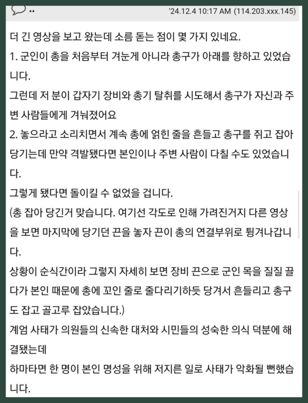 안 대변인이 총기를 붙잡은 행위를 두고 계엄군 측은 “총기 탈취 시도”라고 주장하며 군법 적용 가능성을 시사했다.