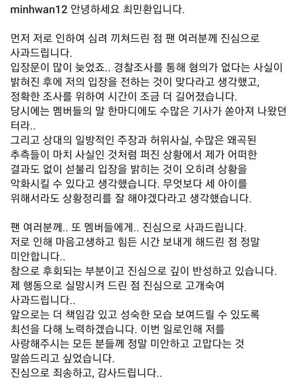 불송치 결정 다음 날 최민환은 자신의 인스타그램을 통해 “심려 끼쳐 드린 점 팬 여러분께 진심으로 사과드린다”라며 “경찰조사를 통해 혐의가 없다는 사실이 밝혀진 후에 저의 입장을 전하는 것이 맞는다고 생각했고, 정확한 조사를 위해 (입장 발표) 시간이 조금 더 길어졌다”고 말했다.