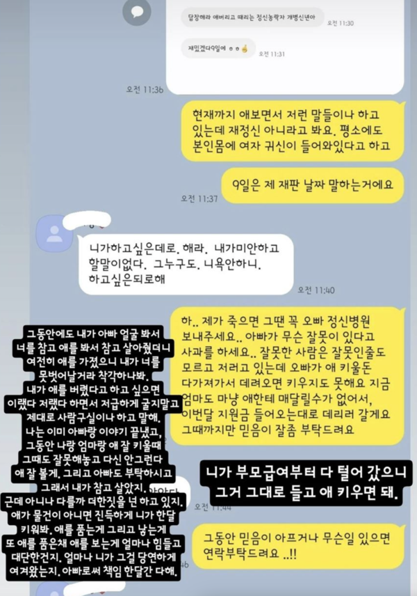 아름은 남편과의 갈등뿐 아니라 시아버지 B씨와의 대화도 함께 공개했다. 메시지에서 아름은 “오빠를 정신병원에 보내든, 오빠와 믿음이를 키워주든 선택해달라”고 요청했고, 이에 시아버지는 “미안하다. 할 말이 없다”고 답했다. 아름은 셋째 아이를 시아버지에게 맡기며 “잘 부탁드린다”고 전했다.