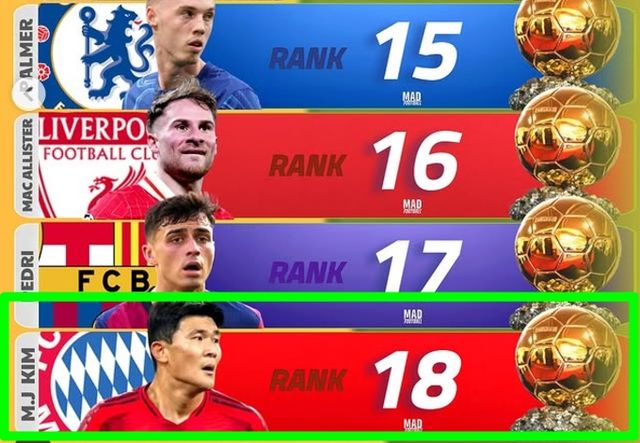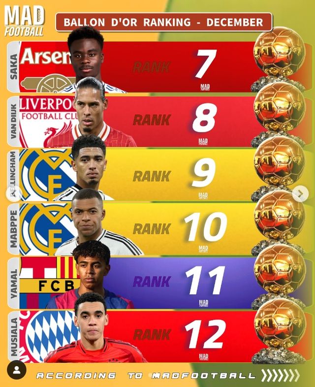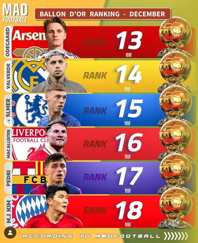 글로벌 매체 '매드풋볼'은 4일(한국시간) 사회관계망서비스(SNS)를 통해 "12월 발롱도르 랭킹"을 발표했다.