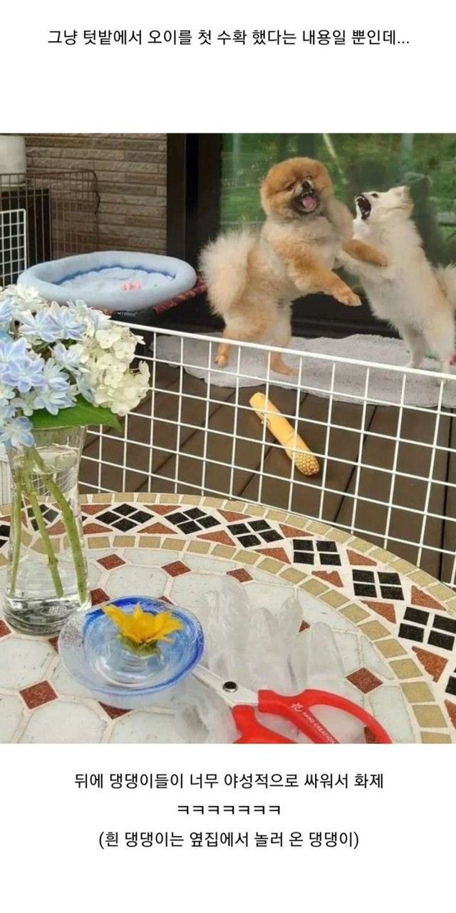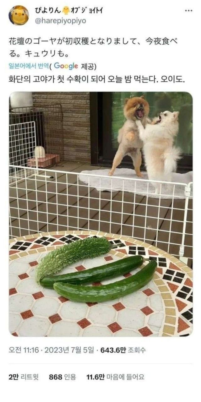 텃밭에서 오이 첫 수확했단 내용일뿐인데….