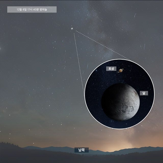 한국천문연구원은 5일 “오는 8일 오후 5시 49분 남쪽 하늘에서 달과 토성이 0.3도로 근접한 모습을 볼 수 있다”며 “맨눈으로 보면 달과 토성이 거의 붙어 보이고, 망원경으로 관측하면 하니의 시야에 들어오며, 이번 근접 현상은 월몰 직전인 오는 9일 0시 14분까지 밤새도록 관측할 수 있다”고 밝혔다.