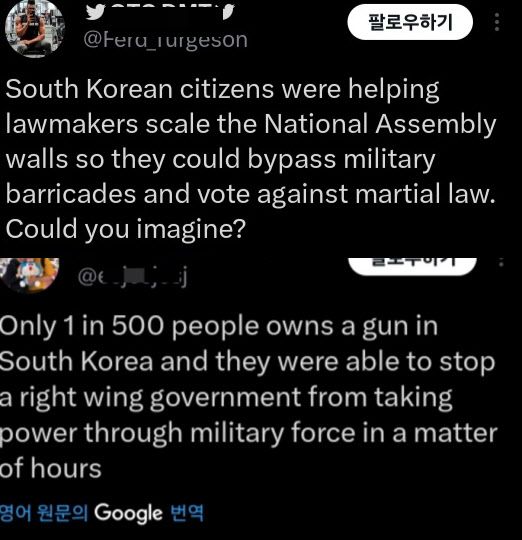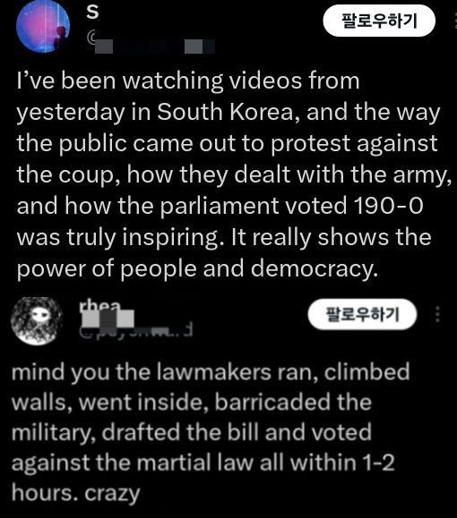 또 다른 누리꾼은 “한국은 시민들이 빠르고 단호하게 행동해서 민주주의를 되찾고 계엄령을 철회했다. 이게 바로 민주주의를 지키는 방법”이라고 적었다. 해당 글에는 “정부를 두려워해선 안 된다” “국민들이 정부에 어떻게 행동해야 하는지 보여 준 전 세계적 모범 사례” 등의 댓글이 달렸다.