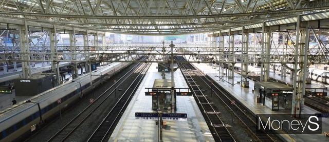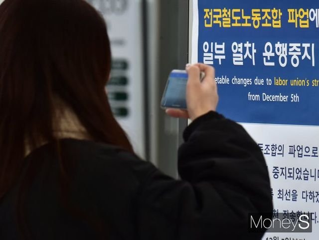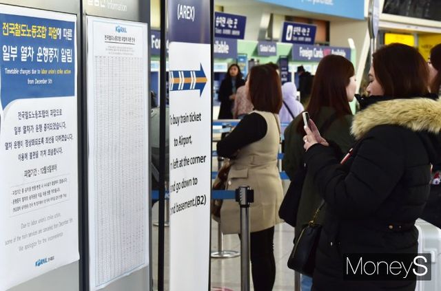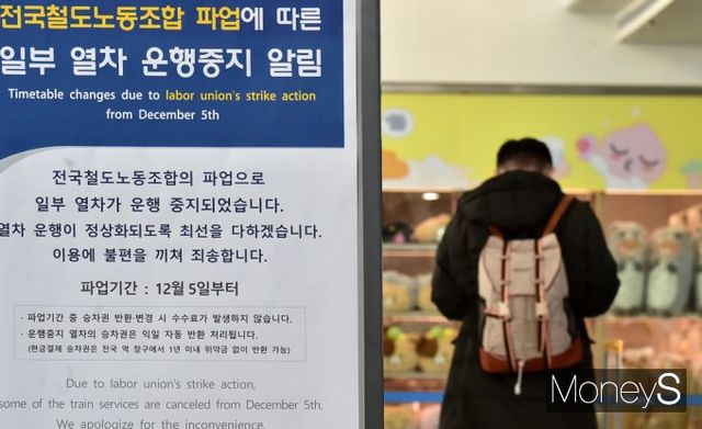 전국철도노동조합이 노사 결렬로 무기한 총파업에 돌입한 5일 서울 중구 한강대로 서울역 대합실에 파업관련 알림판이 설치되어 있다.
