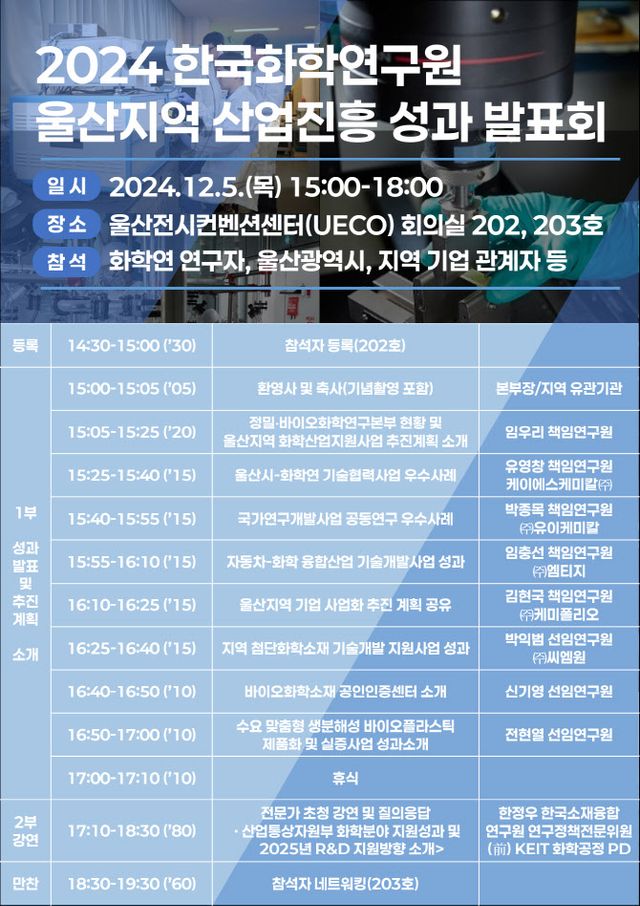 발표회에서 화학연, 울산시, 산업계는 사업화 우수성과와 비전을 공유한다. 화학연과 울산시는 지역기업의 연구개발(R&D) 역량 강화를 위해 2006년부터 18년간 ‘울산시-화학연 기술협력사업’을 지원하고 있다. 생분해성 플라스틱 제품 실증 사업, 바이오화학소재 공인인증센터 등 기업 지원 기반을 구축하기 위해 협력하고 있다.
