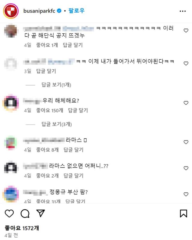 부산 아이파크 대규모 선수단 정리에 대한 누리꾼 반응. / 부산 아이파크 인스타그램