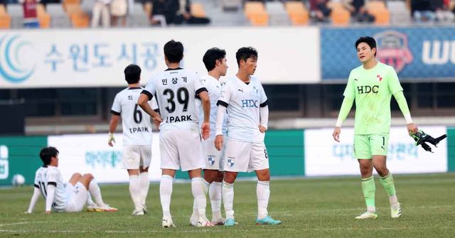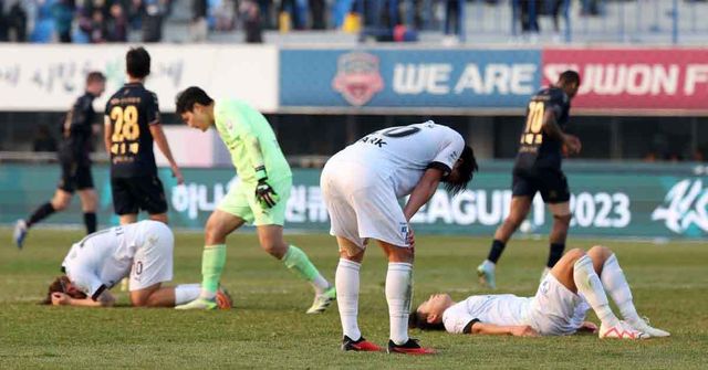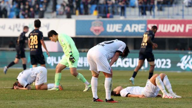 2013년 12월 9일 경기 수원종합운동장에서 열린 하나원큐 K리그 승강 플레이오프 2차전 수원FC와 부산 아이파크의 경기, 부산 아이파크 선수들이 연장 전반 수원FC 정재용의 추가골이 터지자 좌절하고 있다. / 뉴스1