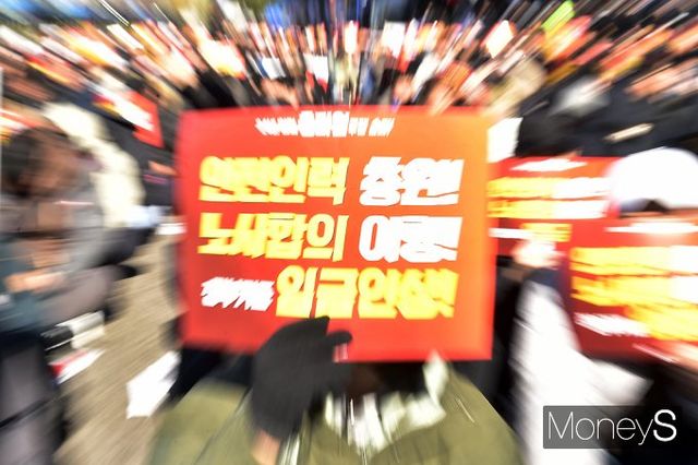 전국철도노동조합이 노사 결렬로 무기한 총파업에 돌입한 5일 서울 중구 한강대로 서울역 12번출구 부근에서 출정식을 진행, 구호를 외치고 있다.