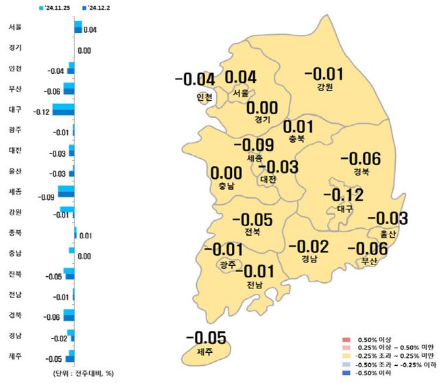 5일 한국부동산원은 12월 첫째주(2일 기준) 전국 주간 아파트가격 동향을 조사한 결과, 매매가격은 0.02% 하락해 지난주(-0.02%) 대비 하락폭을 유지했다고 밝혔다. 지난달 27주 만에 하락세로 전환한 전국 아파트값이 이번 주에도 더 떨어진 것이다.
