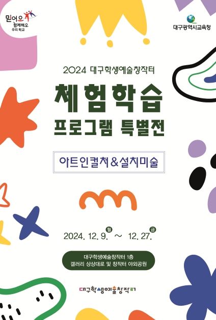 [파이낸셜경제=김영란 기자] 대구시교육청 산하 대구학생예술창작터는 12월 9일부터 27일까지 실내·외 전시 공간에서‘체험학습 프로그램 특별전’을 개최한다.
