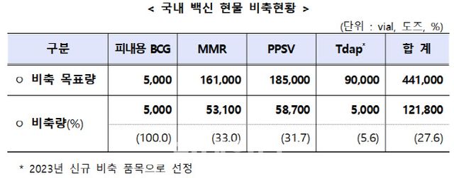 우선 현재 국가예방접종 백신 24개 품목 중 4개 품목(피내용 BCG(결핵), MMR(홍역·유행성이하선염·풍진), PPSV(폐렴구균), Tdap(디프테리아·파상풍·백일해))을 2028년까지 비축 목표량을 달성하겠다는 계획을 세웠다.