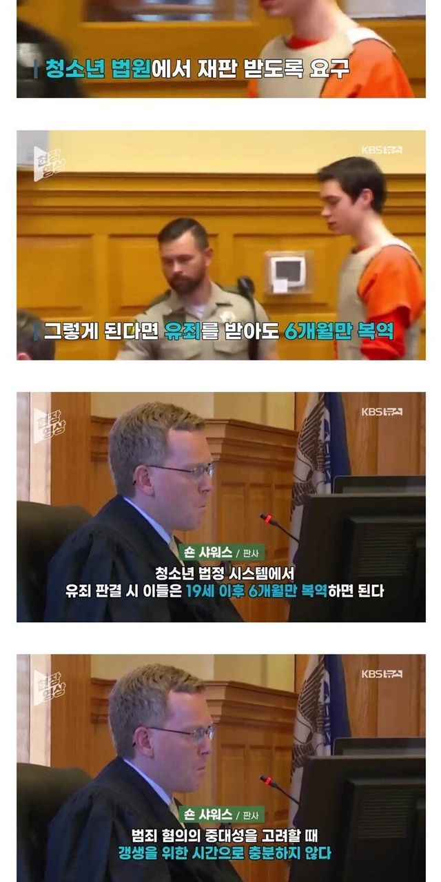 샤워스 판사는 당시 “청소년 법정에서 이들이 유죄 판결나도 19번째 생일 이후 6개월만 복역하면 된다, 범죄 혐의의 중대성을 고려할 때 갱생을 위한 시간으로 충분하지 않다”며 성인에 준해 재판받도록 함.