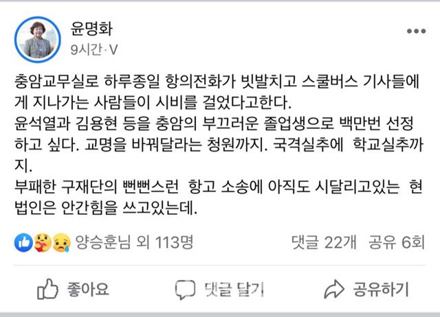 윤명화 이사장은 5일 자신의 페이스북을 통해 “충암(고) 교무실로 하루종일 항의 전화가 빗발치고 스쿨버스 기사들에게 지나가는 사람들이 시비를 걸었다고 한다”고 토로했다.